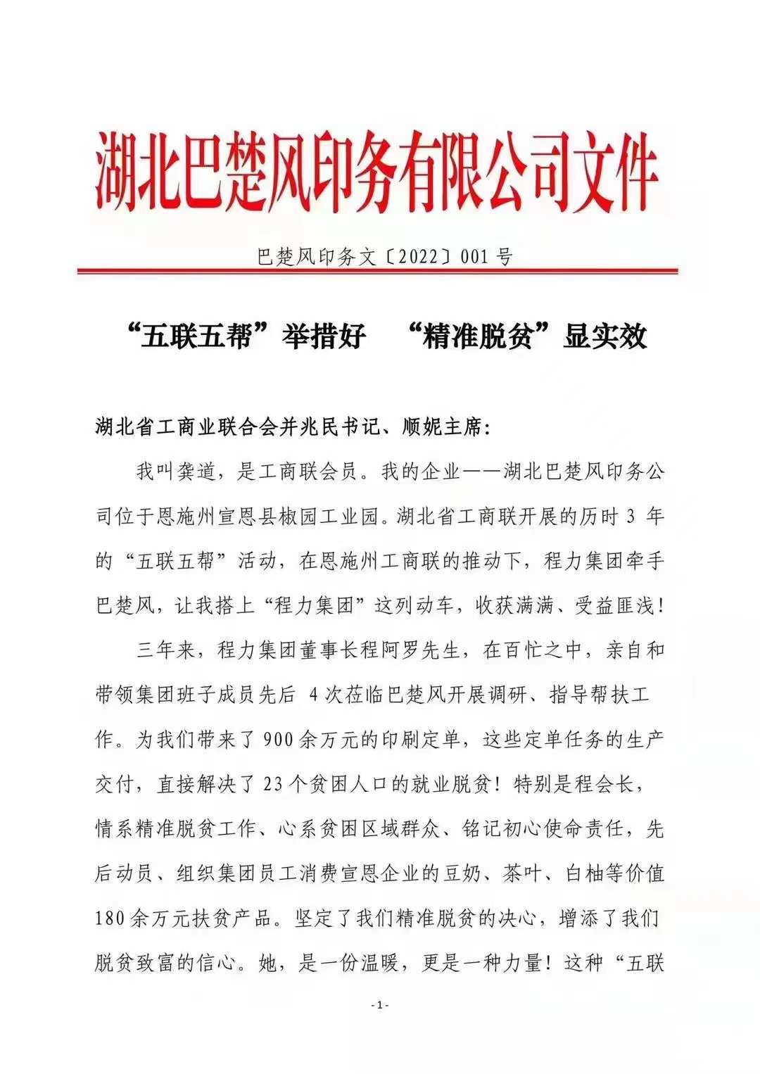2022年元旦,程力集團收到第一份珍貴禮物:“五聯(lián)五幫精準扶貧”感謝信和錦旗,我們倍感欣慰與珍惜!近三年來,程力對省工商聯(lián)指定幫扶單位:恩施宣恩巴楚風印刷公司,不遺余力給與訂單和消費扶貧一千多萬元,還從對其公司管理、黨建、企業(yè)規(guī)范化運行等方面指導,幫助其企業(yè)走出困境,圓滿完成了脫貧攻堅任務。
