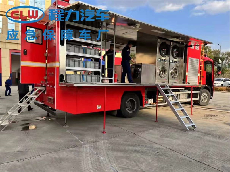被服洗滌消防車該車由廂體、洗滌系統、給排水系統、車載自發電系統、電氣控制系統等構成。廂體裝備了上下對開式側門,上翻形成遮陽擋雨罩,下翻形成作業平臺;裝備了大型工業水洗機和干衣機,洗脫、烘干能力大;