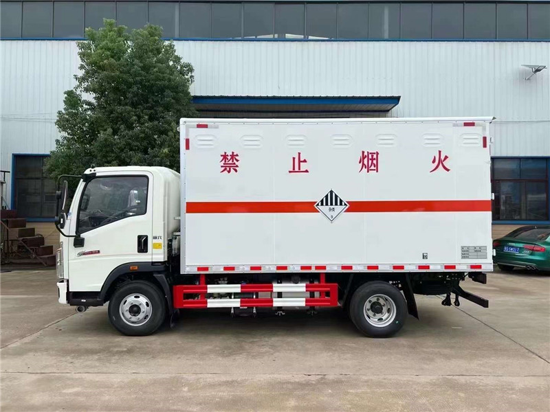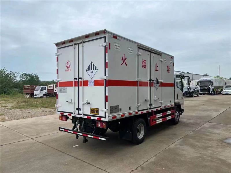 危化品運輸車常規(guī)貨廂尺寸 :4100X2100×2100,可滿足大尺寸需求客戶,可做瓦楞板結(jié)構(gòu),可選裝液壓尾板,總質(zhì)量(kg) :7360,額定質(zhì)量(kg):3480