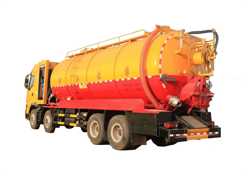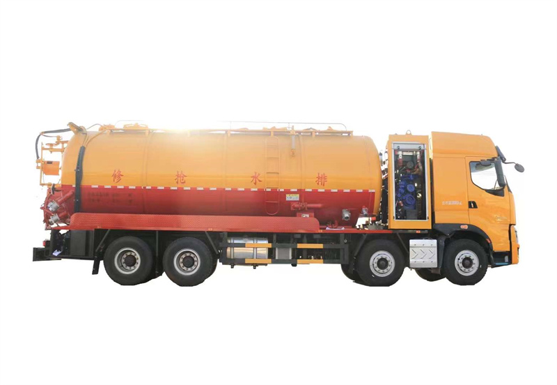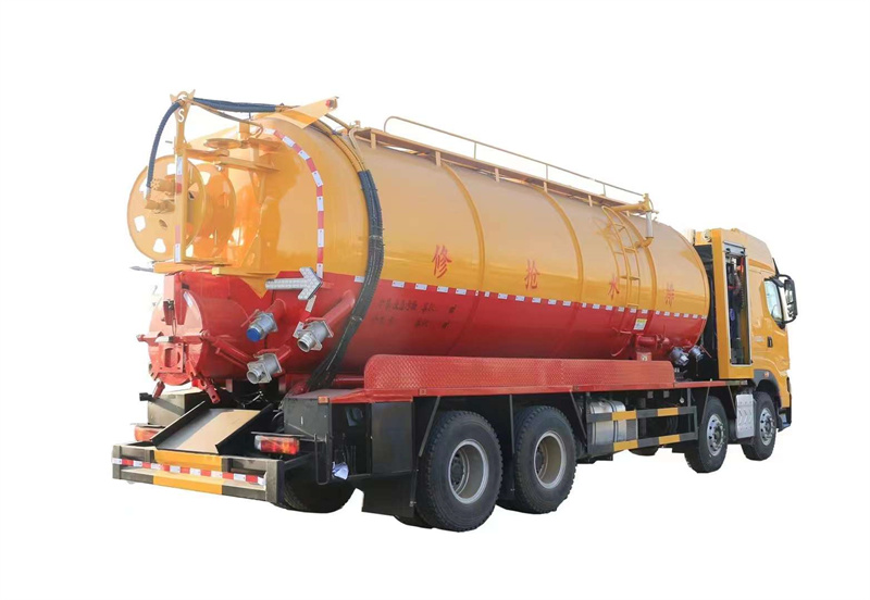 水罐污罐內封頭隔斷。清水罐兩側一邊一個消防栓進水口(副駕駛一側直通罐頂),兩側安裝量管、安裝小球閥放水。清水罐底部一個65方形排水閥。清水罐頂一個排氣閥。兩個三爪罐口(清水罐一個,污水罐一個)。清水罐、污水罐內部安裝爬梯。視糞窗(安裝圓球閥),兩倉互通。污水罐體內鋪不銹鋼薄板,罐體尾部一個700液壓開蓋,罐體兩側平臺用花紋板圍邊,平臺做滿。罐后封頭左側球閥1個6寸150球閥和4個寸的自流一個,600液壓門,右側4寸100鋁合金進料口。寸自流口后不開大門。體副駕駛后部一個150不球閥側排。清水罐、污水罐互通。平臺罐頂部兩側防滑平臺和護欄,后封頭一個視污管(安裝圓球閥),罐頂抽氣管加一個球閥開關,里面安裝自制防溢流閥。雙耀品浮315流量高壓泵,氣吹水,100米25高壓管,選裝濰柴420副發,后封頭液壓卷盤折疊、伸縮。后尾部封頭裝箭頭燈。M型保險杠(兩邊封口),安裝大工具箱,按照客戶提供圖片制作,其余廠內標配。