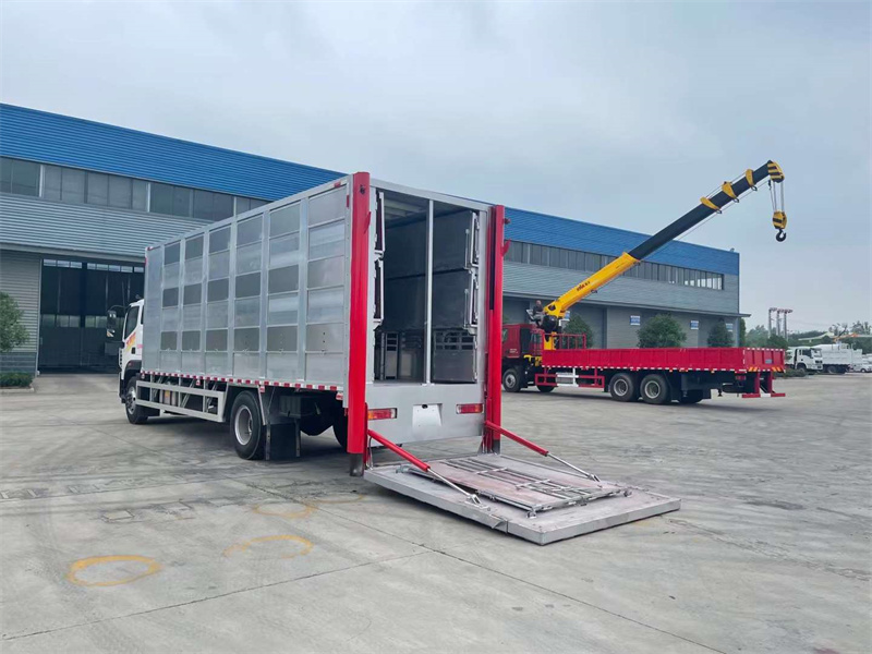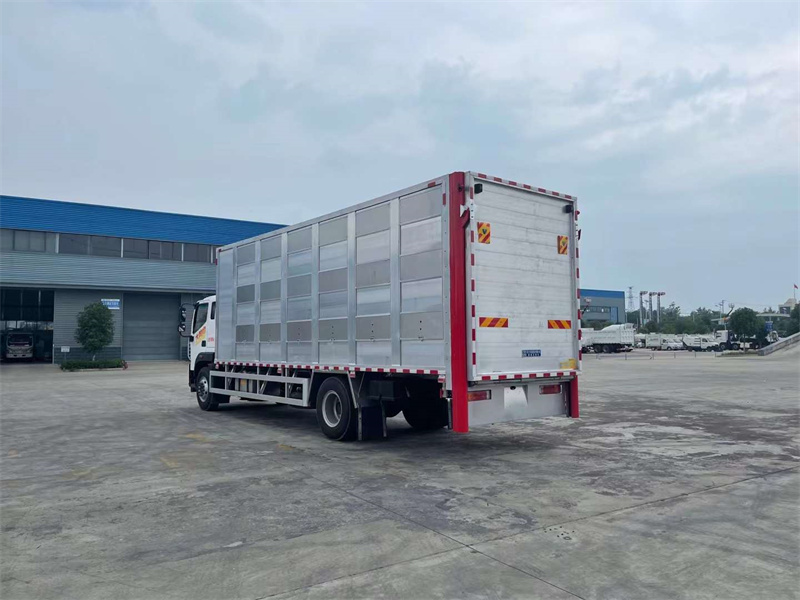 福田奧鈴單橋畜禽運輸車,玉柴245馬力發動機,法士特8檔變速箱,5750mm軸距,電動玻璃,中控室,遙控鑰匙,空調,廂體長度7.7米,箱體采用高強度鋁合金專業定制型材拼裝焊接而成,整車三層,每層3個欄位,共9個欄位,每欄配2個鴨嘴式飲水嘴和2個噴霧頭,內部的地板可翻起,頂部的天花板可以翻起(可選裝自動頂升),方便人員進出各個欄位,裝卸豬,進行沖洗,車廂前部配備9個送風風機,后部配備6個排風風機,共15個,進行每層的交替吹風,配備雙溫機組,調節廂內溫度,配備空氣過濾,車尾部整體液壓升降平臺,廂內帶監控攝像頭和溫度探頭,可實時監控。環保?燃油齊全。程力廣東粵西(茂名)辦事處聯系電話18672220111