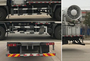 專用裝置為抑塵霧炮,用于城市抑塵.整車長/軸距/后懸對應關系為(mm):9260/5100/2720;8860/4700/2720;8860/4500/2920;8260/4200/2620;7860/3950/2470;防護材料:Q235A碳鋼,連接方式:左右側面采用焊接連接,后下部防護采用螺栓連接,后部防護斷面尺寸(mm):120×50,后部防護離地高度(mm):490.ABS,型號/生產廠家:3631010-C2000/東科克諾爾商用車制動系統(十堰)有限公司,ABS-E 4S/4M/生產廠為威伯科汽車控制系統(中國)有限公司。選裝霧炮型號:WF-60/WF-80/WF-100所對應的整備質量分別為:9550kg/10500kg/11200kg。隨底盤選裝駕駛室。