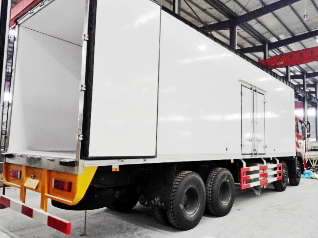 二、廂體配置:采用我公司液壓吸附一體成型生產線制造,保溫性能達到國家A級標準廂體內部尺寸為:9400X2400X2450(mm)容積為55立方, 廂體內外面料采用最新款納米玻璃鋼(不吸光、隔熱性好、硬度強、抗氧化),廂體厚度為8cm,內襯骨架為防銹處理武鋼優質輕鋼型材,保溫材料為無空隙填充聚氨酯發泡,廂體底部為鋁合金花紋板或選平面納米玻璃鋼,廂體采用鍍鋅不銹鋼包角,加厚型鋁合金包邊,后門框為不銹鋼,加厚型不銹鋼后門合頁及鎖件,廂體內部采用LED照明燈及廂體示寬燈。