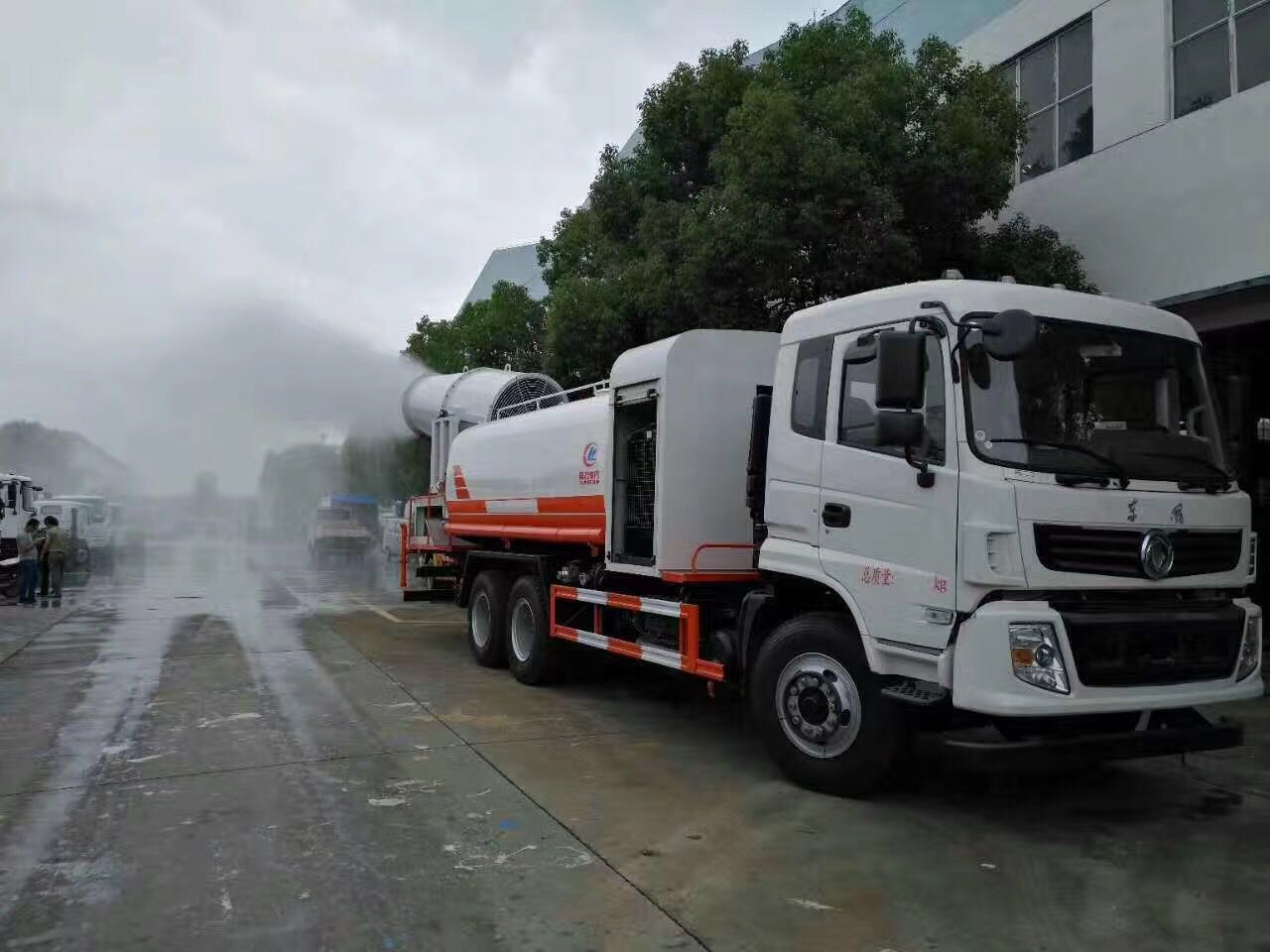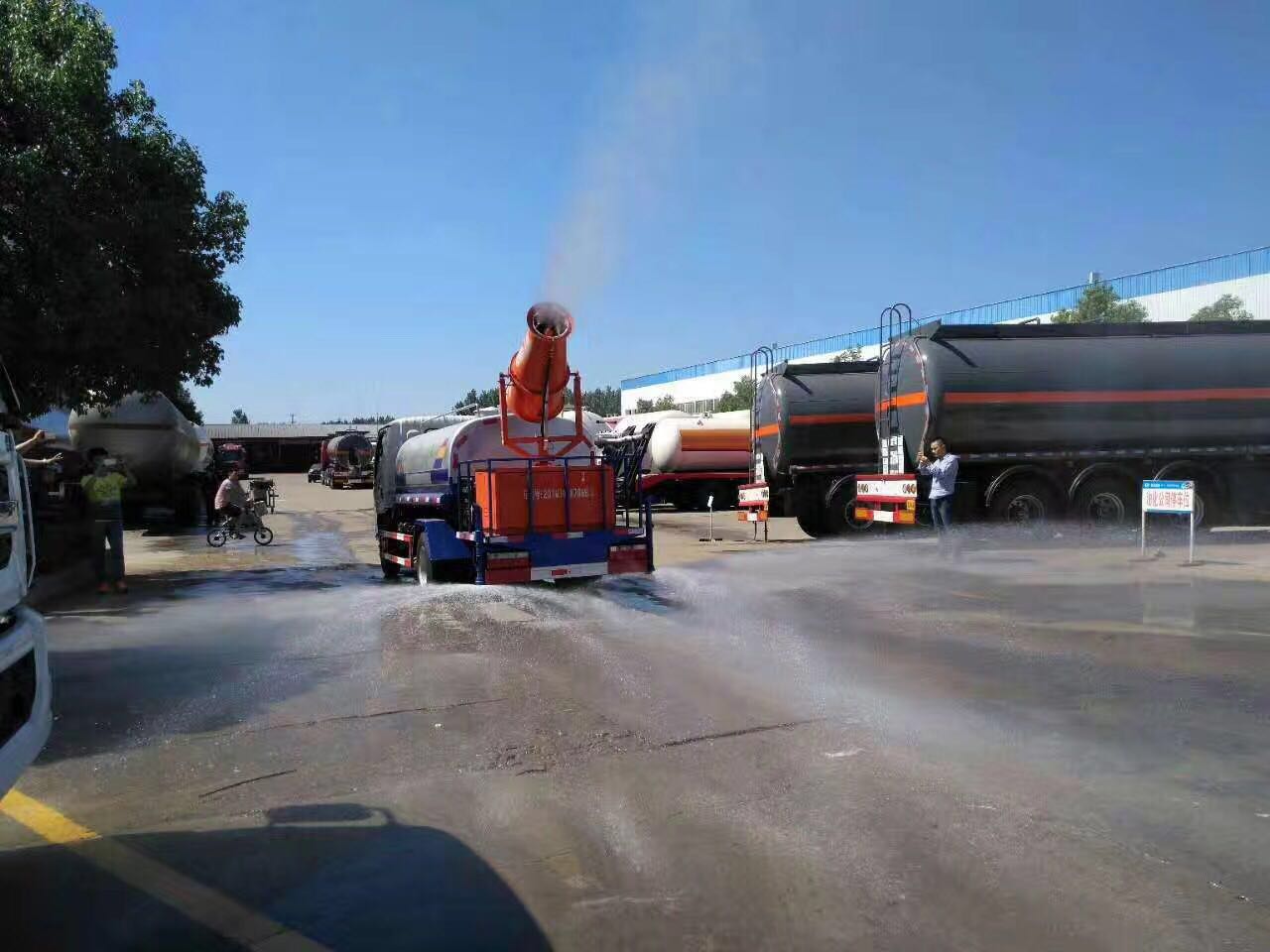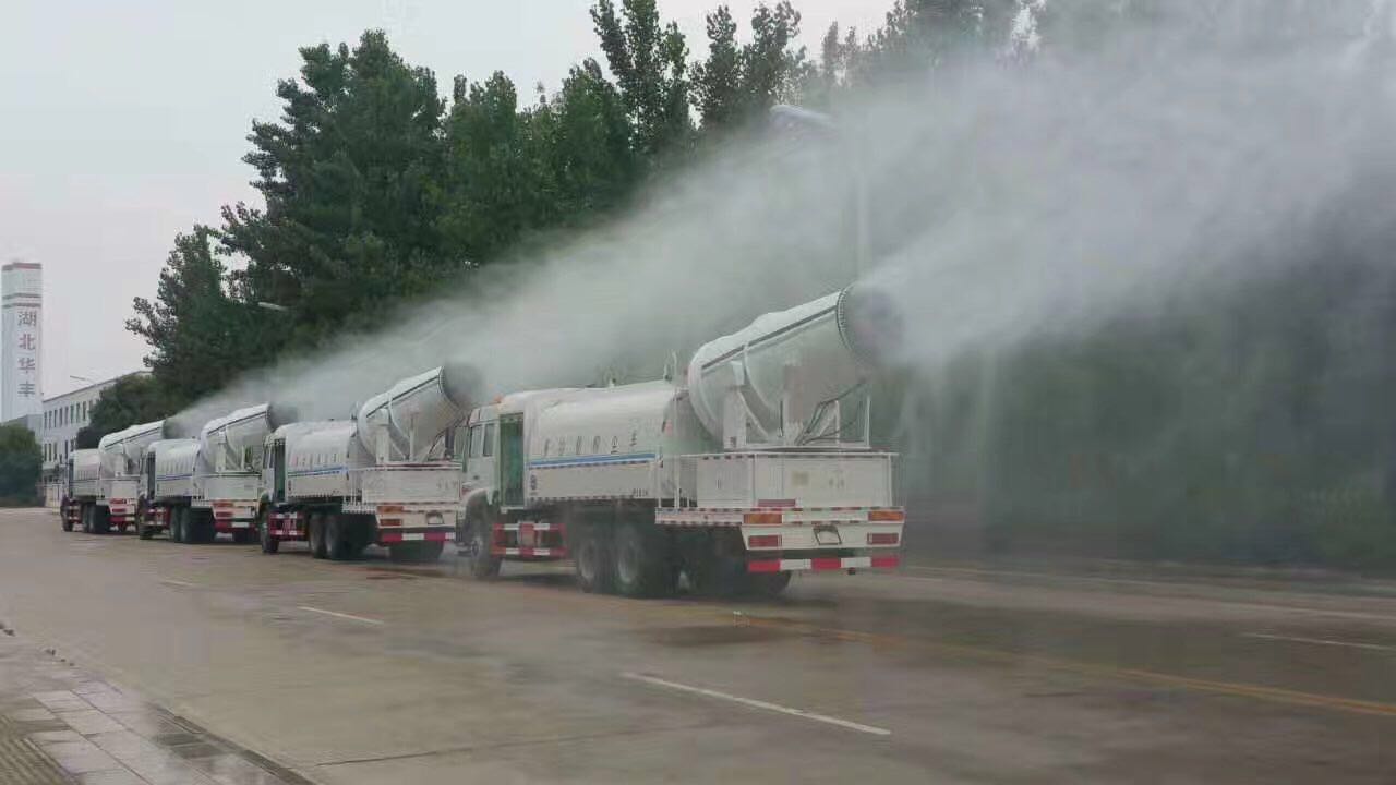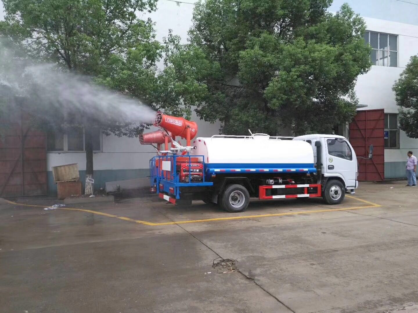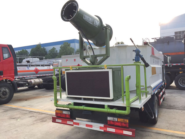1、基本配置:水罐容積4立方米、常規最大配備CLW-50噴霧炮射程達25-30米、配套7.5KW汽油發電機、前沖后灑、側噴、平臺高炮、自流閥及消防接頭各1個、水管2根、8T以上高位花灑2個,標配億豐泵或金龍泵。