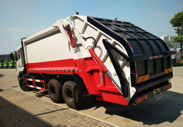 上裝配置:弧形箱體,容積約18-20立方,可裝垃圾15-17噸,采用特種鋼板制作,箱體底板6mm,邊板6mm,廈門銀華油缸,江蘇多路閥,長源液壓油泵,填裝器舉升油缸帶液壓鎖裝置,采用進口西門子PLC電控系統(帶一鍵操作,和手動操作兩種控制方式),電控操作盒三只。帶3個污水收集箱,尾部帶橡膠密封條。填充器加裝后照明燈,箱體油漆及噴字按用戶要求定制。