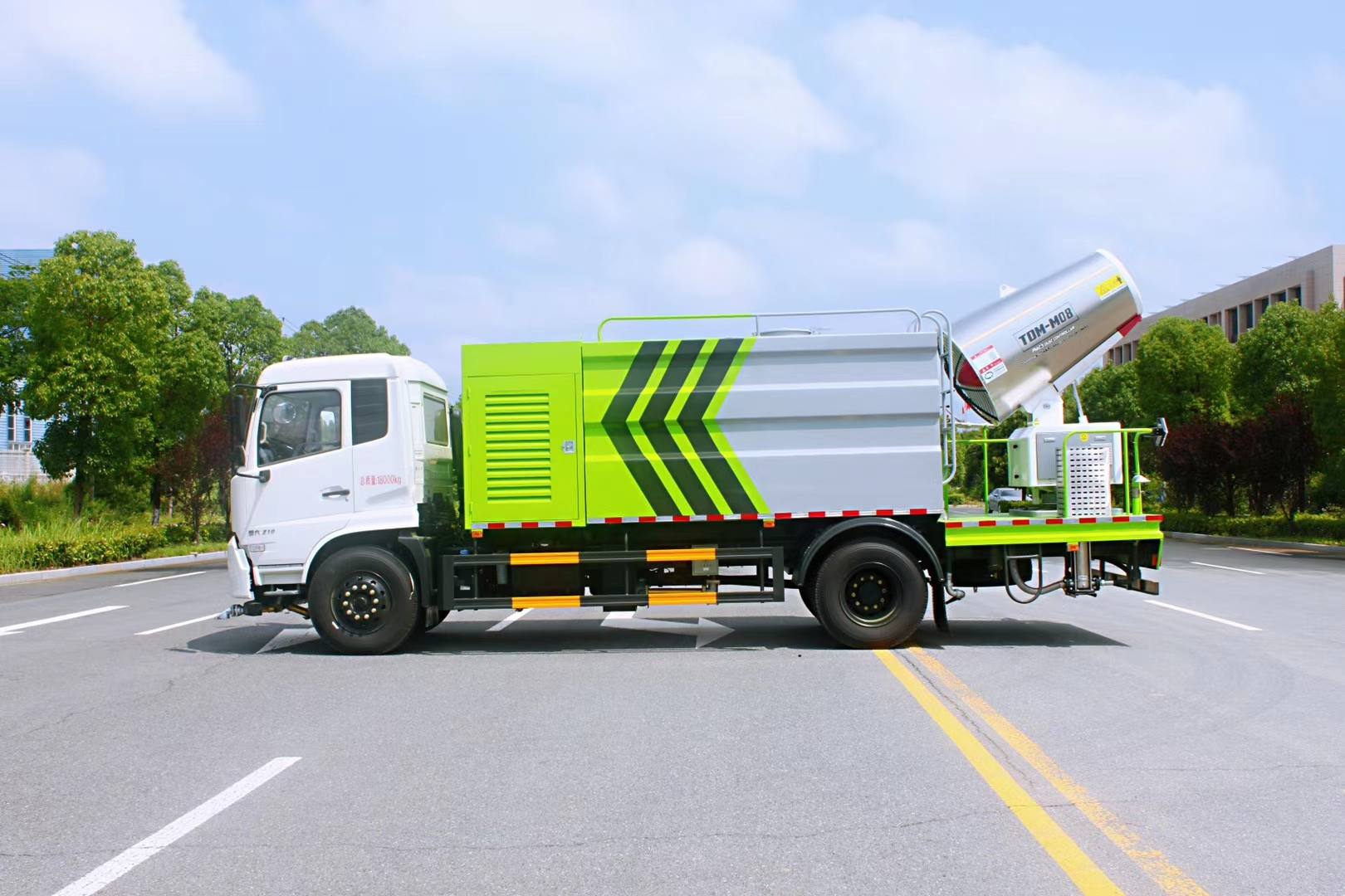 1.該車(chē)用途為抑塵降霾.主要裝置為抑塵霧炮.隨底盤(pán)選裝高度不同的駕駛室;2.選裝前霧燈;3.選裝駕駛室頂部裝飾燈;采用5000mm,4700mm軸距底盤(pán);4.選裝前部平板掛件裝置對(duì)應(yīng)整車(chē)長(zhǎng)/軸距/前懸/后懸/前伸/后伸(mm)對(duì)應(yīng)關(guān)系為:8980/4700/1400(1430)/2700(2670)/180/無(wú)后伸;9630/4700/1400(1430)/2700(2670)/180/650;選裝后部霧炮裝置對(duì)應(yīng)整車(chē)長(zhǎng)/軸距/前懸/后懸/后伸(mm)對(duì)應(yīng)關(guān)系為: 8800/4700/1400(1430)/2700(2670)/無(wú)后伸; 9100/5000/1400(1430)/2700(2670)/無(wú)后伸; 9450/4700/1400(1430)/2700(2670)/650;9750/5000/1400(1430)/2700(2670)/650.5.側(cè)、后防護(hù)材料為Q235,連接方式為焊接連接固定,后部防護(hù)裝置斷面尺寸(寬×高)50×150(mm),后部防護(hù)離地高度:480mm.6.ABS型號(hào)/生產(chǎn)廠家:3631010-C2000/東科克諾爾商用車(chē)制動(dòng)系統(tǒng)(十堰)有限公司,ABS 8/東科克諾爾商用車(chē)制動(dòng)系統(tǒng)(十堰)有限公司,4460046450/威伯科汽車(chē)控制系統(tǒng)(中國(guó))有限公司.7.選裝噴霧裝置及擺放樣式.